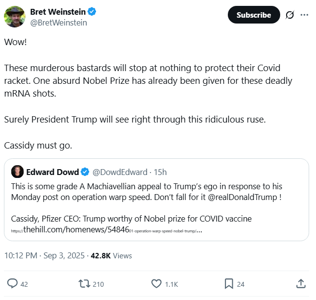 9/4/2025 Eric Weinstein referring to the comment below: “The price of not coming clean about the abuse of trust in Public Health will be the loss of Public Health.”…